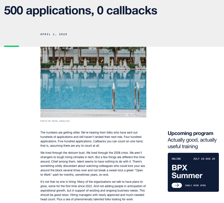 Layoffs have been deep and extensive. I’ve spoken with multiple folks who have been unemployed for months if not years. For every posting that goes up, the candidate pool is as deep as the Marianas Trench, to the point where being seen has virtually stopped working.